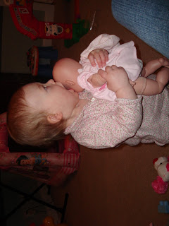 Campbell is still a dancing fool, starting to bounce everytime she hears some music. Her favorite toys this month are probably her Baby and her ball. She carries her baby doll all over the place, puts her in the stroller, puts her in the chair and sits on top of her, and asks us to 'please' put her hat on Baby quite often. The ball is new and she LOVES playing ball with Daddy. Books are still of course a favorite and she's becoming a little more interested in slightly longer stories. We're still not ready for paragraphs yet, but she can sit still through a sentence or two per page and is completely engrossed in the story. Her other favorite pastime is playing with Lexi's dog bowls which I'm not a fan of. Luckily Lexi eats all her food at one sitting, so there is only some occasional water to splash in. We weren't so fortunate at a playgroup one Friday when we caught Campbell and her friend at the dog's bowls, with handfuls and cheekfuls of dog food. HAHAHA Oops. Bad Mommy. In addition to dog food...Campbell enjoys singing songs and playing games like pattycake and other little rhymes. This is starting to sound like a singles ad...long walks on the beach, candlelit dinners, I should move on.